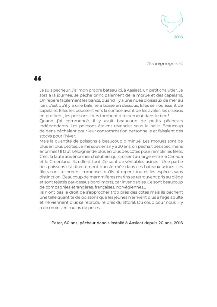 "La quantité de poissons à beaucoup diminué. Les morues sont de plus en plus petites. Je me souviens il y a 20 ans, on pêchait des spécimens énorme ! Il faut s’éloigner de plus en plus des côtes pour remplir les filets. C’est la faute aux énormes chalutiers qui croisent au large, entre le Canada et le Groenland. Ils raflent tout." Peter, 60 ans, danois installé à Aasiaat depuis 20 ans, 2016